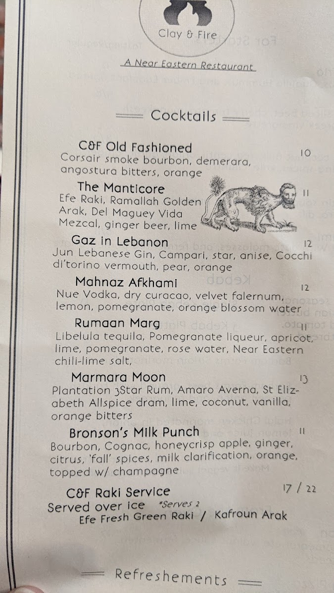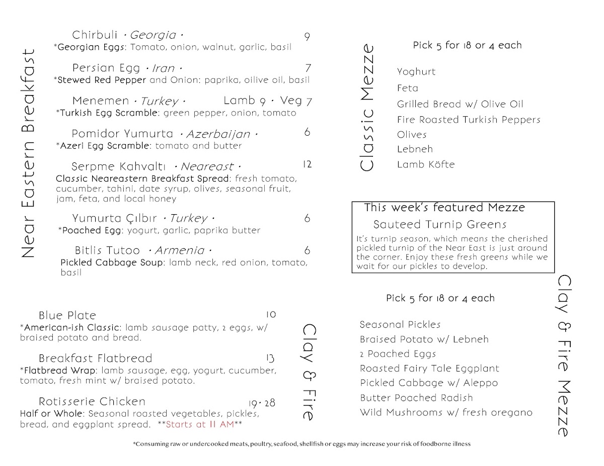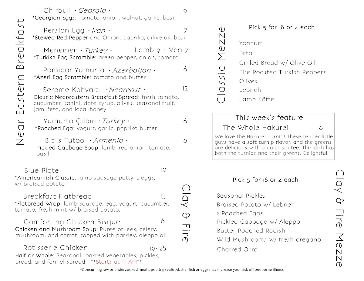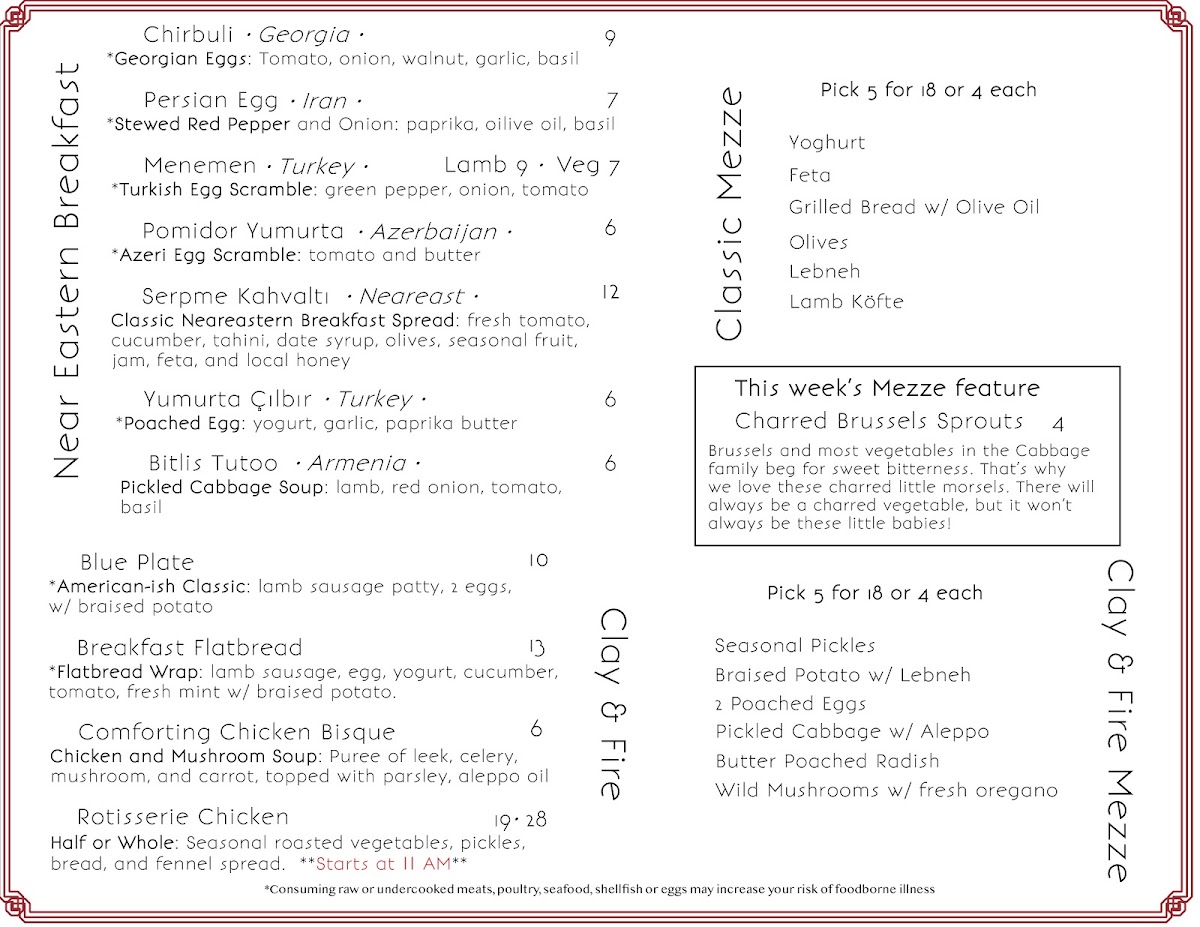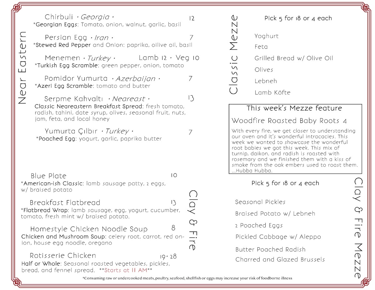 The restaurant's menu is a delightful testament to the quality and creativity behind each dish. Begin your meal with the Classic Mezze, featuring a velvety roasted garlic hummus for just $5.25, or dive into the Clay and Fire Mezze, which includes seasonal house pickles and chipotle pepper hummus, both priced at the same irresistible rate. For brunch or lunch, don't miss the signature Woodfire Root Hash, artfully prepared with chicken fond compound butter, rutabaga, white sweet potato, baby Brussels sprouts, red onion, and a perfectly poached egg, all for $15.00. Each ingredient is thoughtfully sourced, allowing the fresh flavors to shine through, making every dish a true celebration of culinary craftsmanship.